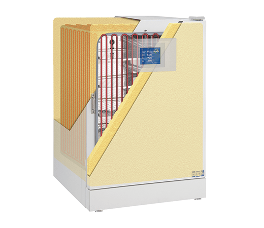 The direct heat incubator uses heating elements placed around the chamber, in the door perimeter, and in the door itself to provide balanced temperature within a steel, insulated chamber environment. Door and perimeter heaters can be adjusted independently to ensure uniformity even when the incubator is installed in more demanding ambient temperatures.